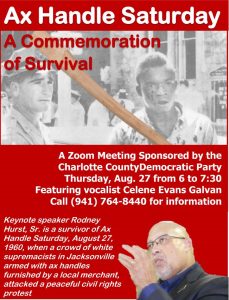 On Thursday, August 27, 2020 at 6 PM, Charlotte County Democrats will commemorate Ax Handle Saturday, the day in 1960 when more than 200 Whites with baseball bats and ax handles attacked 34 Black NAACP Youth Council members in Jacksonville, Florida. Register for this free Zoom virtual event here. By James Abraham, Charlotte County Dems
