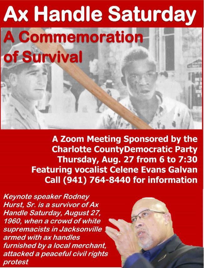 On Thursday, August 27, 2020 at 6 PM, Charlotte County Democrats will commemorate Ax Handle Saturday, the day in 1960 when more than 200 Whites with baseball bats and ax handles attacked 34 Black NAACP Youth Council members in Jacksonville, Florida. Register for this free Zoom virtual event here.