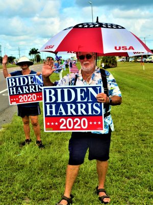 You may have seen us on Saturday mornings or Tuesday afternoons standing by the north side of Tamiami Trail in Port Charlotte. We’re wearing blue or sometimes crazy apparel, holding Biden-Harris, David Jones or Allen Ellison signs (occasionally all three!) and rigorously waving. Frequently we receive an appreciative honk and thumbs-up.